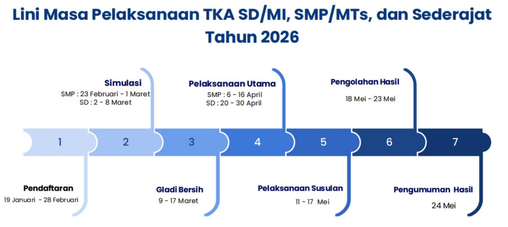 Lini Masa TKA untuk tingkat SD dan SMP tercantum dibawah ini. Mulai dari Pendaftaran TKA sampai dengan pengumuman Kelulusan / Hasil TKA. Pendaftaran TKA mulai tanggal 19 Januari 2026 untuk SD & SMP sampai 28 Pebruari 2026. Untuk lebih jelasnya bisa dilihat bagan yang tertera.