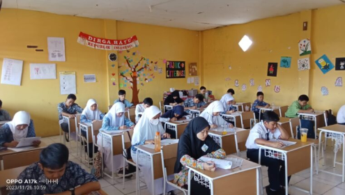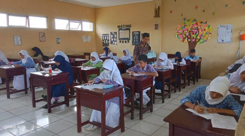 pelaksanaan babak penyisihan diselenggaran di ruang kelas SMP Islam Al Muhajirin Depok. Peserta menjawab soal diruang tes yang telah disiapkan dengan penuh konsentrasi dari berbagai peserta dari tingkat SMP yang mengikuti babak penyisihan tersebut.