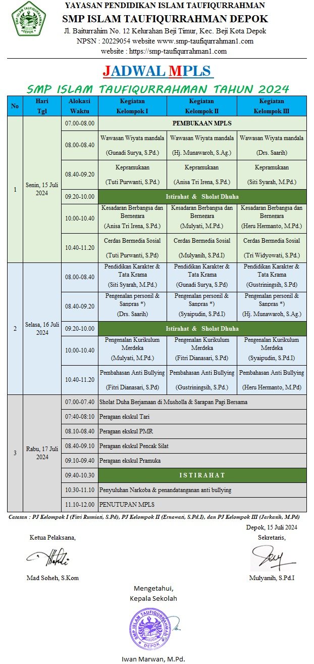 Kegiatan MPLS di SMP Islam Taufiqurrahman membagi tiga kelompok, yaitu kelompok I, Kelompok II, dan Kelompok III. Masing-masing kelompok terdiri dari 20-27 peserta. Berikut jadwal Pelaksanaan Masa Pengenalan Lingkungan Sekolah di SMP Islam Taufiqurrahman Kecamatan Beji, Kelurahan Beji Timur, Kota Depok :