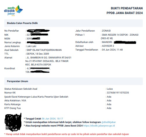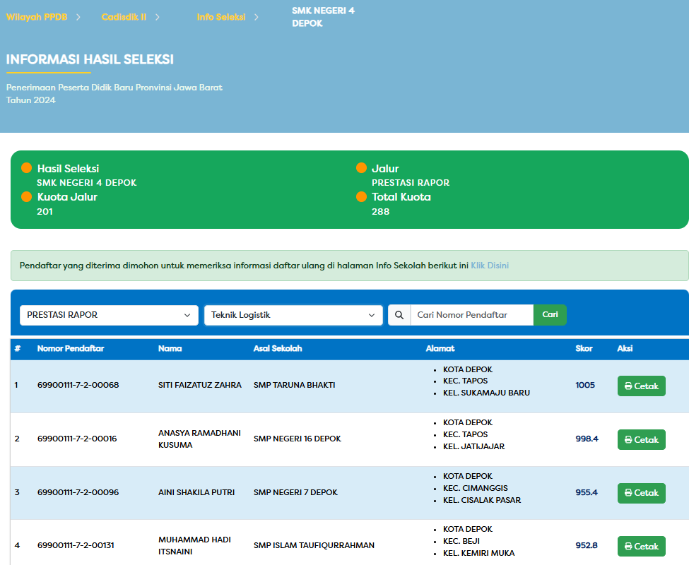 Pengumuman kelulusan tahap 1 dilaksanakan pada tanggal 19 Juni 2024 secara online dengan cara membuka website https://ppdb.jabarprov.go.id/ selanjutnya pilih wilayah-ppdb dan klik hasil seleksi. Berikut ini siswa dari SMP Islam Taufiqurrahman yang ingin mencoba mendaftarkan dirinya ke SMA Negeri atau SMK Negeri Kota Depok dan sudah diberikan akun adalah sebagai berikut :