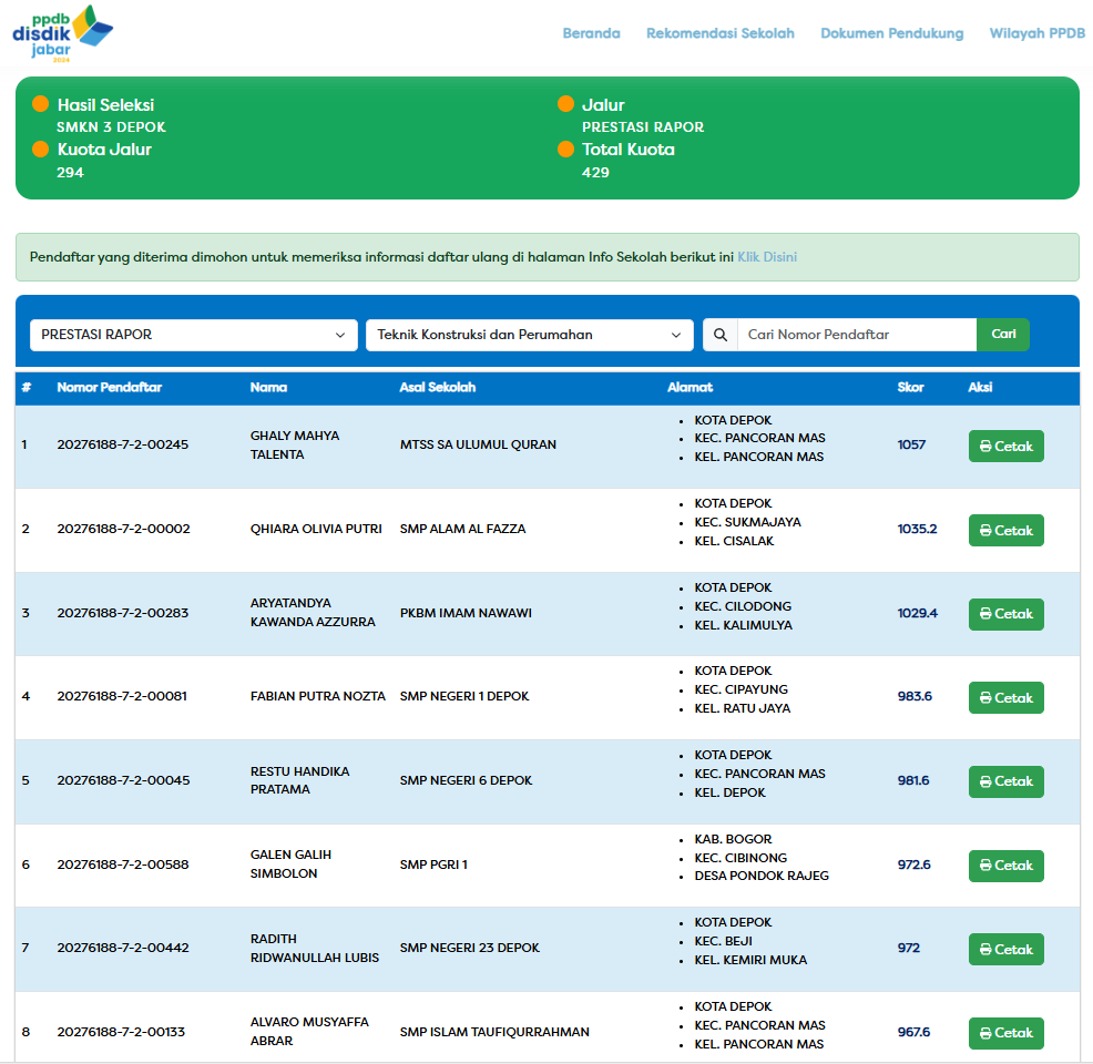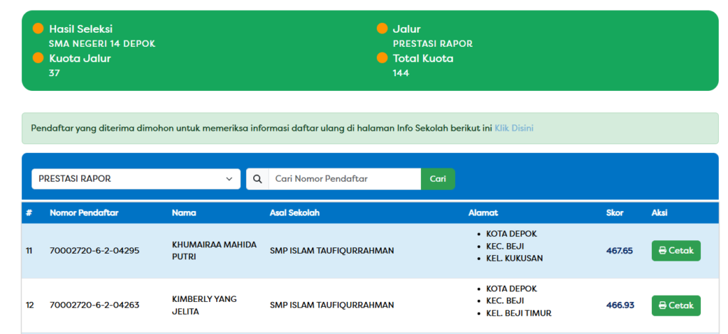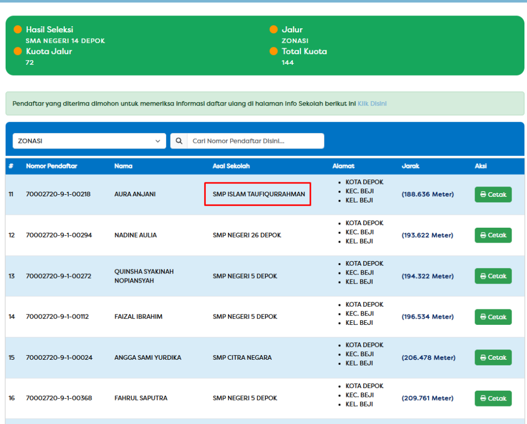 Berikut peserta atau pendaftar dari SMP Islam Taufiqurrahman Depok yang dinyatakan diterima atau lulus masuk ke SMA Negeri atau SMK negeri di kota Depok Jalur zonasi & jalur KETM dan lainnya adalah sebagai berikut :