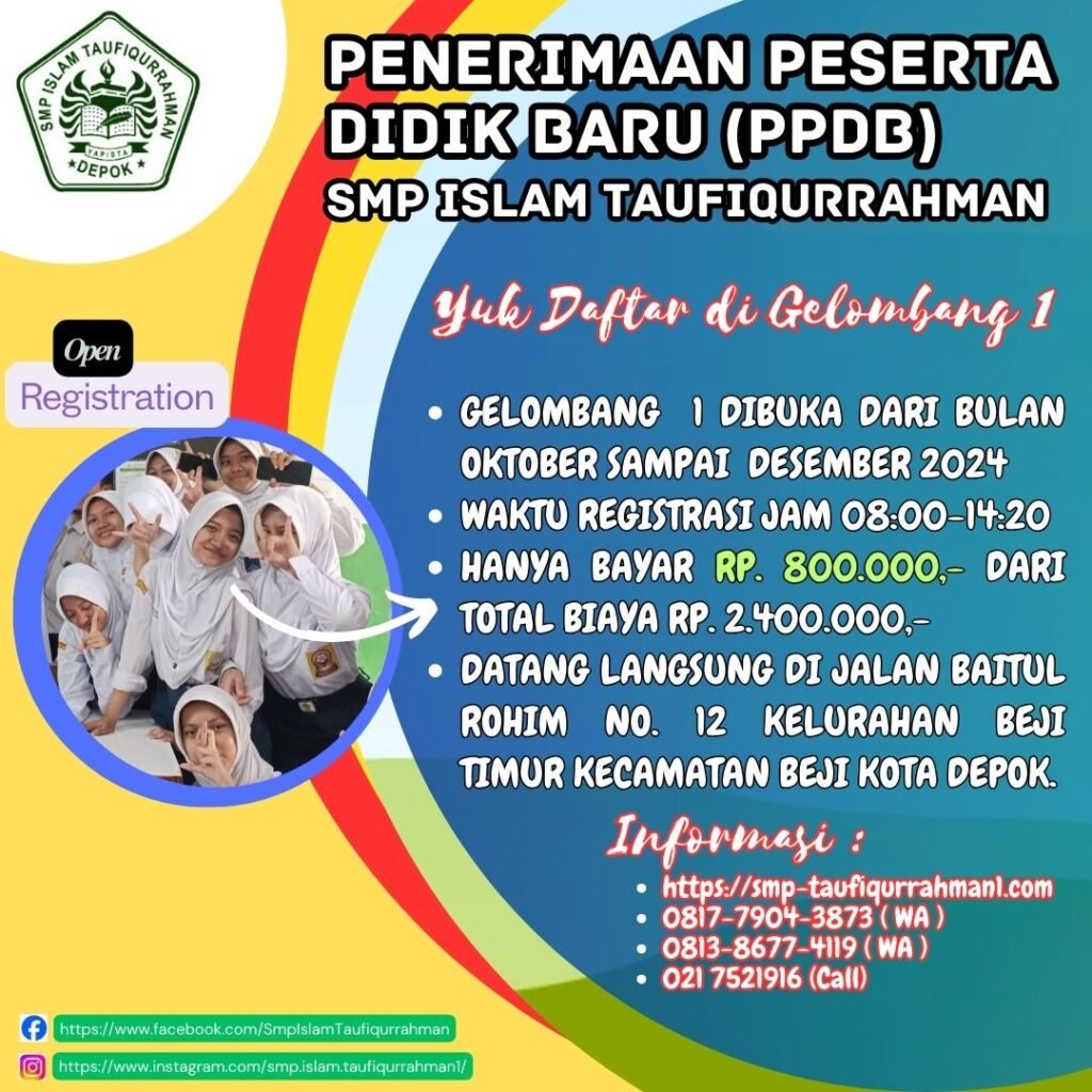 Blog PENERIMAAN SISWA BARU 2025-2026 mad.soheh05 October 16, 2024 Spread the loveSMP Islam Taufiqurrahman menerima siswa baru dan siswa pindahan untuk tahun pelajaran 2025-2026 mulai bulan Oktober-Desember 2024 GELOMBANG PERT AMA. Berikut informasi PPDB untuk Gelombang Pertama sebagai berikut : About the Author mad.soheh05 Administrator Visit Website View All Posts Post navigationPrevious: MERAKIT KABEL UTPNext: MATERI ULANGAN KE 1 ELEARNINGLeave a Reply Cancel replyYour email address will not be published. Required fields are marked *Comment *Name * Email * Website Save my name, email, and website in this browser for the next time I comment. Related News Blog STUDY TOUR 2025-2026 mad.soheh05 October 26, 2025 Blog PELEPASAN ALUMNI SMP ISLAM TAUFIQURRAHMAN DEPOK mad.soheh05 June 21, 2025 Blog PENILAIAN SUMATIF AKHIR TAHUN (PSAT) SMP ISLAM TAUFIQURRAHMAN K7-8 mad.soheh05 May 20, 2025