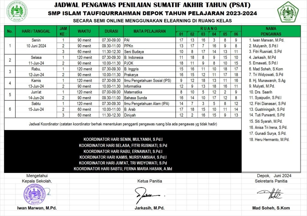 Di tahun pelajaran 2023/2024 siswa kelas 7-8 mengerjakan soal PSAT menggunakan elearning secara online dari ruang tes yang telah ditentukan sesuai dengan kartu peserta yang diberikan. Peserta dapat mengerjakan soal dengan waktu yang terjadwal. Pelaksanaan Penilaian Sumatif Akhir Tahun (PSAT) dimulai dari tanggal 10-15 Juni 2024 menggunakan 6 ruang tes, 1 ruang pengawas, dan 1 ruang panitia. Penyusunan program kerja mengaju dengan kalender pendidikan provinsi Jawa Barat, Kalender pendidikan kota Depok, dan surat edaran dari Kementrian Pendidikan Kebudayaan Riset dan Teknologi.