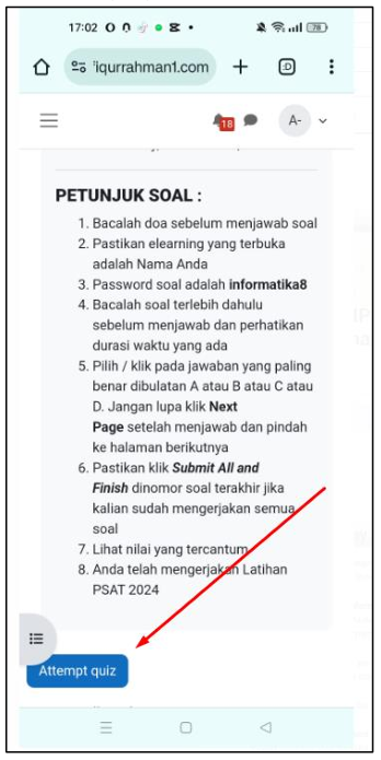 Adapun langkah-langkah dalam menjawab atau mengerjakan soal PSAT adalah : (1) mempersiapkan kartu peserta (2) membuka elearning smp-taufiqurrahman2.com/elearning-1 untuk peserta kelas VII (tujuh) dan elearning.smp-taufiqurrahman1.com untuk peserta kelas VIII (delapan) (3) memasukan username & password lalu klik login (4) memasukan sandi soal / password soal (5) memilih mapel yang diujikan (6) Mengerjakan soal dan Finish.