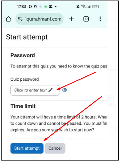 7. Masukan password soal (lihat dipetunjuk soal atau minta ke pengawas ) lalu klik Start attempt