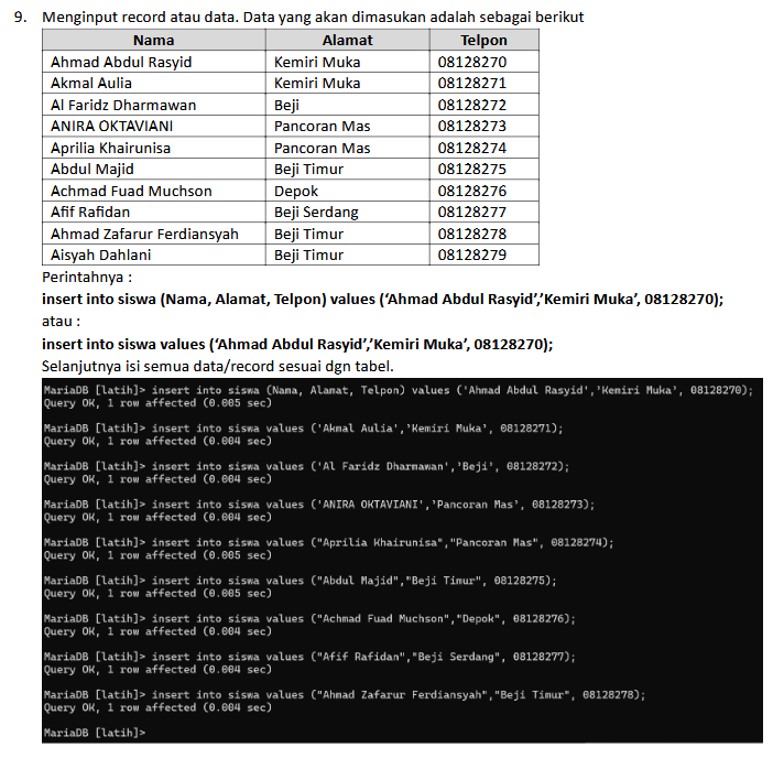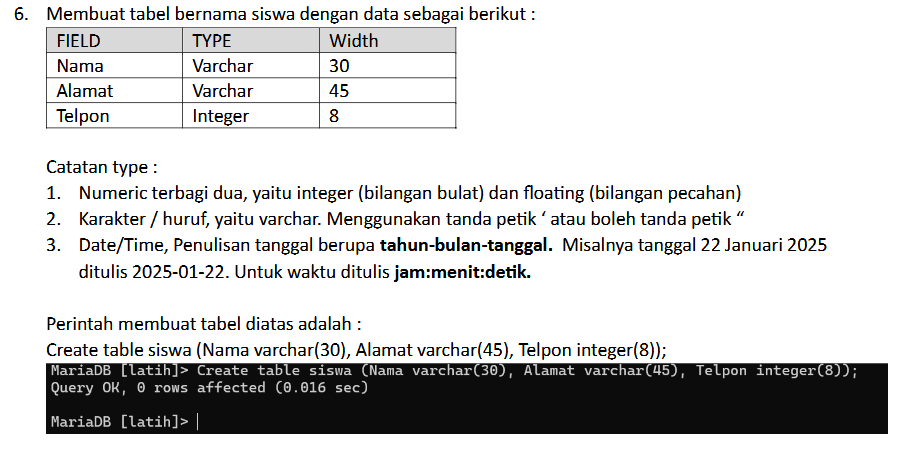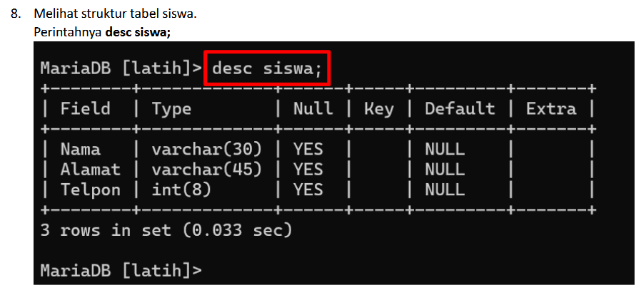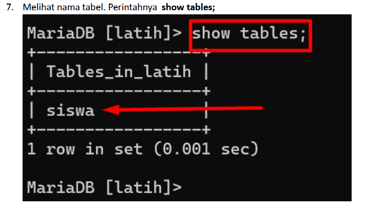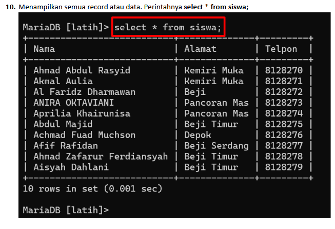 1. Perintah SELECT * FROM murid; digunakan untuk menampilkan semua kolom dan semua baris dari tabel bernama murid.
