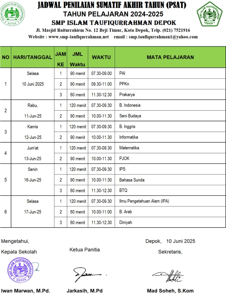 Aplikasi yang digunakan berupa elearning yang bernama LMS moodle. Alamat elearning yang dapat dibuka bagi kelas VII adalah www.smp-taufiqurrahman.com/elearning dan untuk kelas VIII adalah smp-taufiqurrahman.sch.id/elearning untuk membuka elearning tentunya harus mengetahuai username & password, yang dapat dilihat di kartu peserta PSAT. Pelaksanaan PSAT diselenggarakan dari tanggal 10-17 Juni 2025 dengan jadwal tercantum dibawah ini :